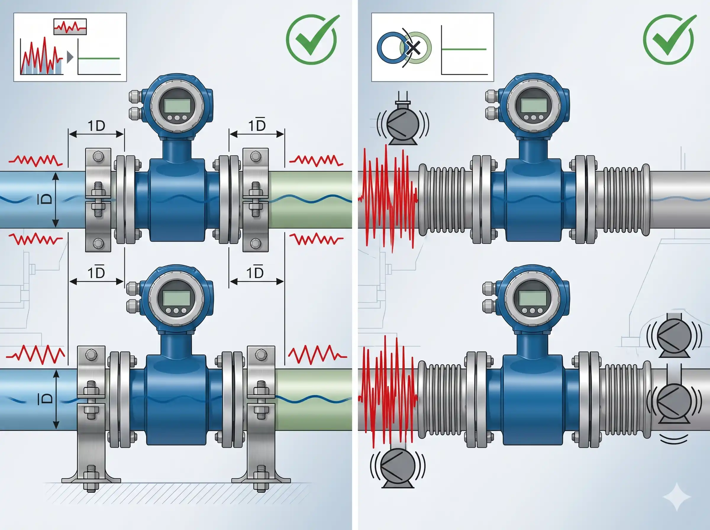 Core Conclusion: If pipe vibration exceeds 2.2 g in the 20–150 Hz range, you must install flexible bellows or support brackets within 1D of the flowmeter flanges.